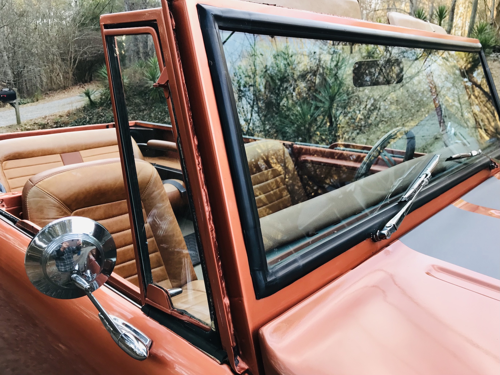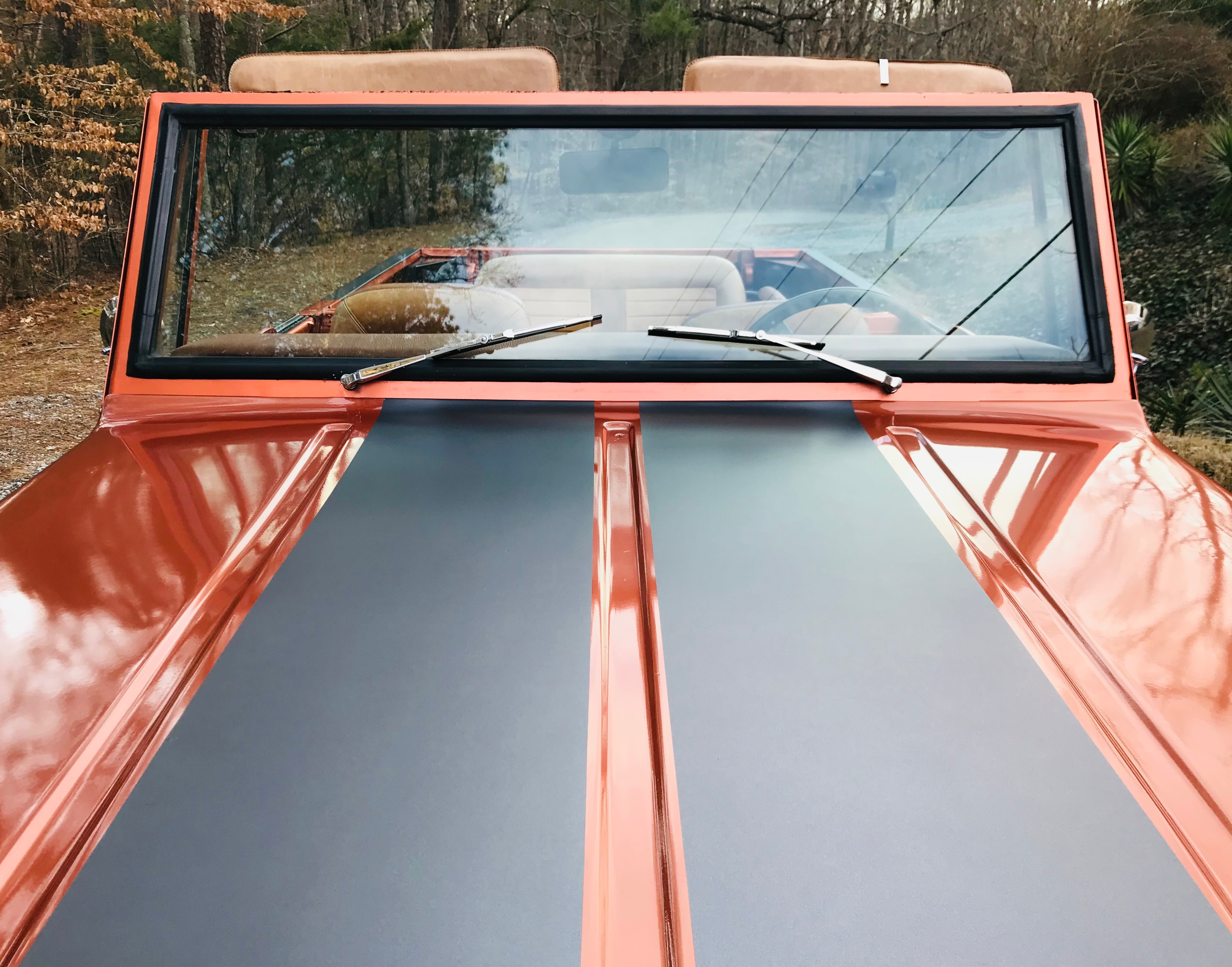 The body has had three sandings, then sealed with three coats of satin clear to maintain the original paint. The interior was media blasted and started from scratch. Custom leather throughout, a 6-speaker sound system and 7-inch touch screen were added, all new tinted glass and seals and custom carpet.